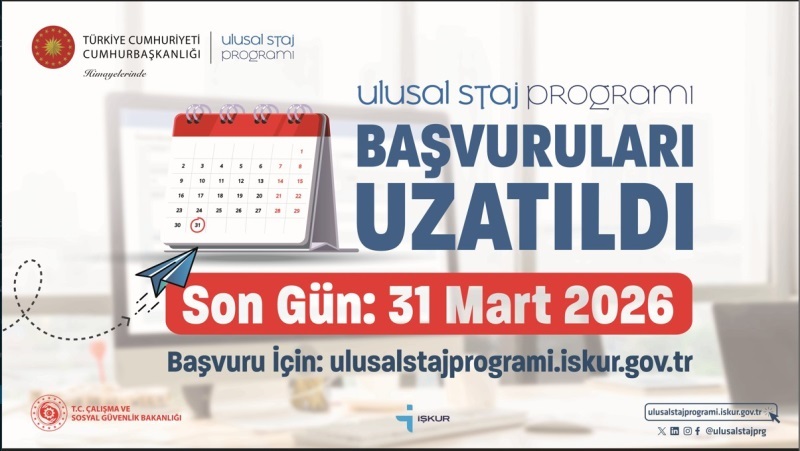 Cumhurbaşkanlığı Himayelerinde Türkiye İş Kurumu (İŞKUR) koordinasyonunda 2026 yılı “Ulusal Staj Programı” öğrenci başvuruları 06 Ocak 2026 tarihinde başlamış olup 16 Mart 2026 tarihine kadar devam edecektir.